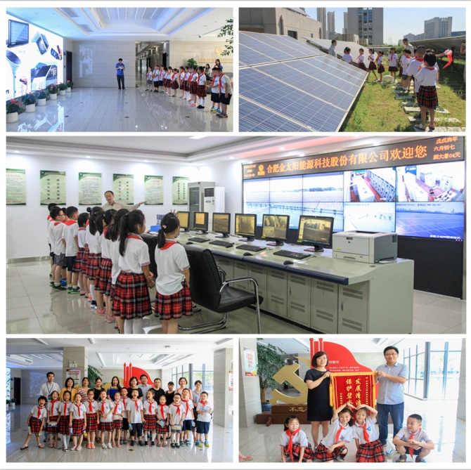 在一楼大厅,金太阳公司技术顾问黄继业给孩子们上了一堂活泼生动的光伏发电科普课。黄继业通过一幅幅图片,浅显易懂、妙趣横生的解说,将太阳、阳光、电能等抽象的概念形象化,将这些小学生带入科技的海洋。小家伙们听得津津有味,不时参与安全用电小问答,气氛十分活跃。在集控中心,孩子们观看了公司光伏电站的实时画面,看到大型地面电站宏伟壮观的电池阵列,他们不约而同地发出惊叹和由衷赞叹。在公司楼顶,孩子们和家长实地参观了电站,认识了主要光伏设备。